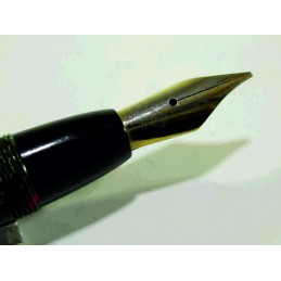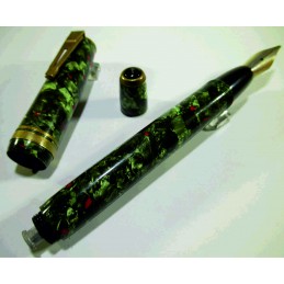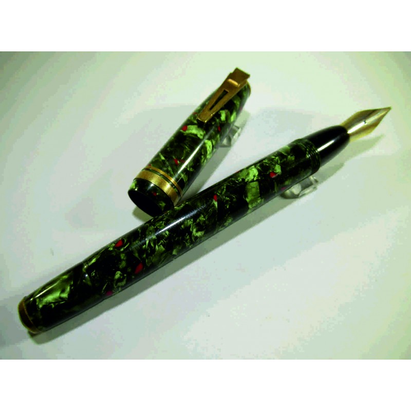 Gros stylo plume français, sans marque apparente, (longueur fermé 135 mm, diamètre capuchon 15 mm), celluloïd rouge et vert, plume acier « IRIDIUM POINTE SUPER», sac absent, barre de compression et bouton poussoir en bon état, bon état général, pour collection. Sans garantie pour utilisation.