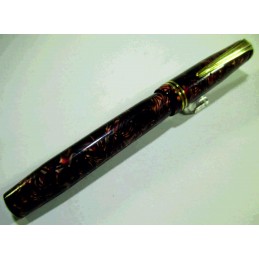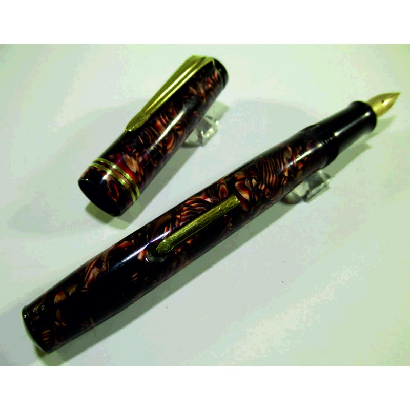 Stylo plume sans marque apparente, en celluloïd rose et noir, longueur capuchon fermé 112 mm, diamètre du capuchon 12.5 mm, plume or « WARRANTED – 18 CTS - 1st QUALITY », system de remplissage à poussoir fonctionnel, sac présent, nettoyé, bon état général, sans garantie pour être utilisé, pour collection.