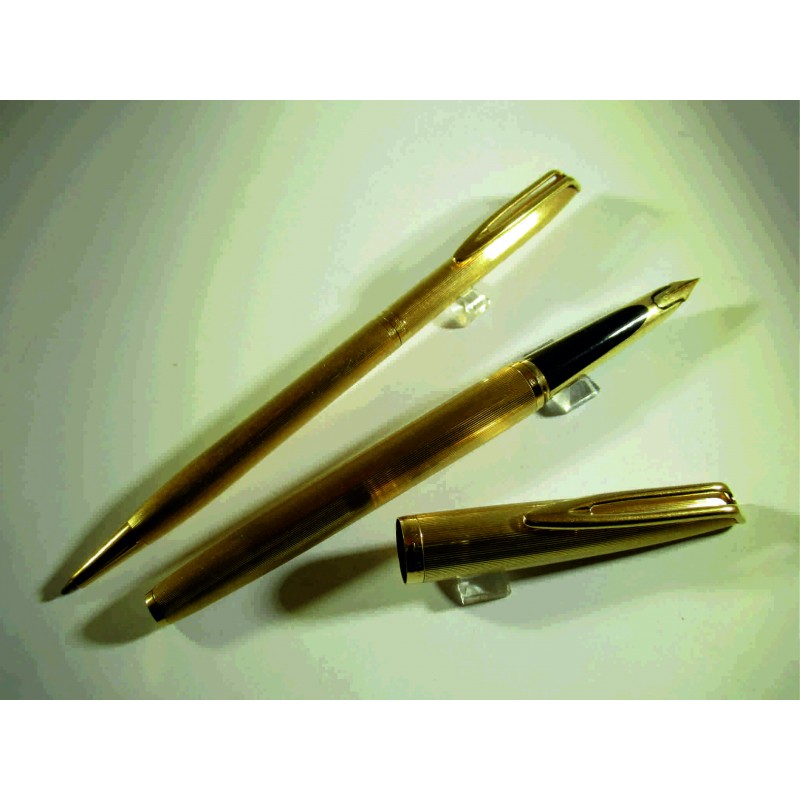 Parure stylo plume et stylo à bille WATERMAN CF, plaquée or, plume or « 18 K - 750 », cartouche non fournie, bon état général, le stylo à bille est fonctionnel mais il faut changer la cartouche. Pour collection ou pour écrire.