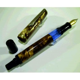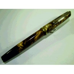 Fountain pen probably German, marking on the barrel « Le Frevire », in brown and gold celluloid, closed cap length 126 mm, cap diameter 13 mm, steel nib « 14 CT GOLD PLATED », piston filling system functional, never used, good general condition, without guarantee to write, for collection.